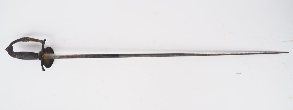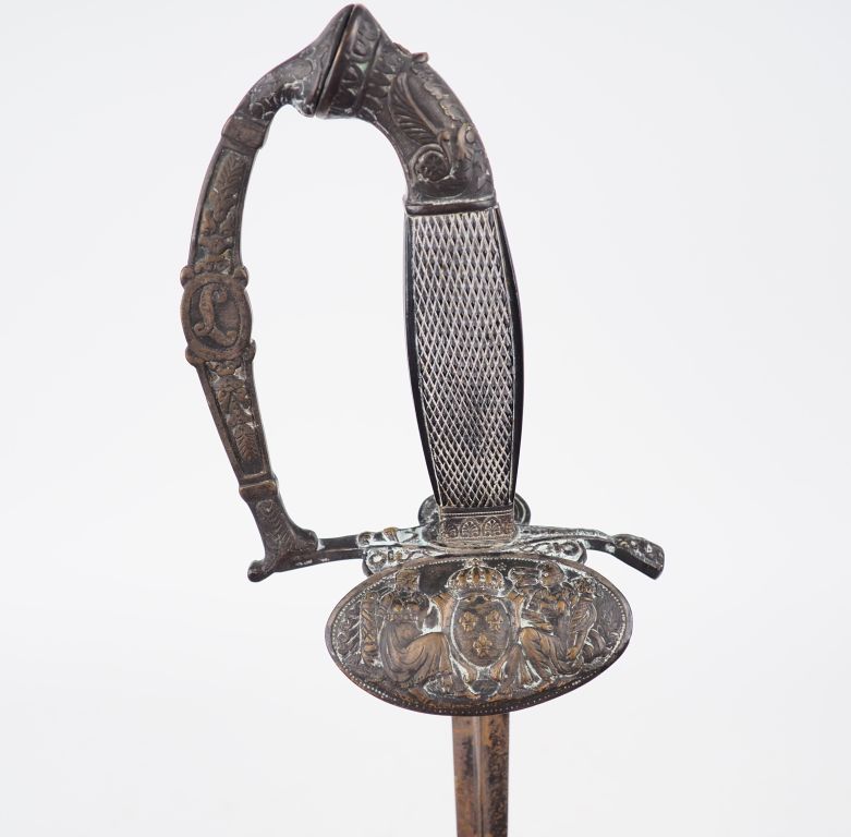 Épée d'officier époque Restauration, lame triangulaire à 3 pans creux, dorée et bleuie au tier, monture en bronze doré, plateau de garde principal ovale arqué vers l'avant à décor des armes de France couronnées présentées par une gloire et une renommée. Calotte en crosse à courte queue, branche de garde unique plate, écusson central au chiffre de Louis, ladite branche joignant à angle droit la croisière de garde. Quillon arqué vers l'avant, fusée galbée en ébène quadrillé sur les faces et strié sur les flancs. Pas de fourreau.