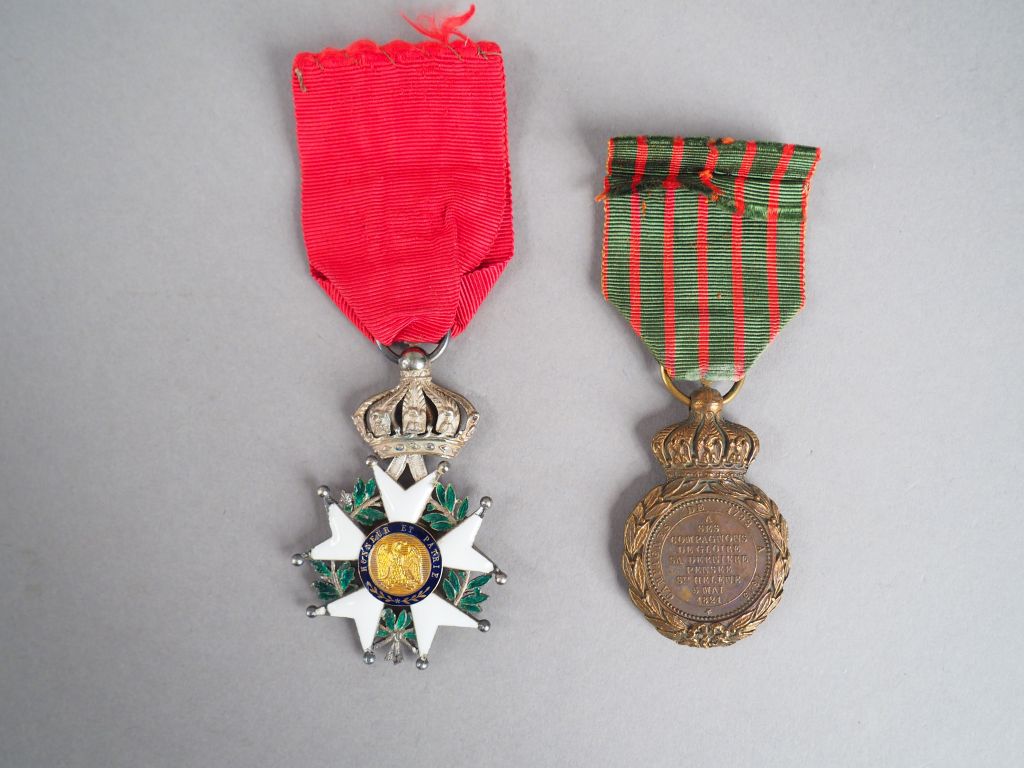 Etoile de chevalier de la Légion d’Honneur couronne mobile, aigles aux fleurons de la couronne, avec son ruban (quelques manques aux émaux blanc des pointes, centres intacts). On y joint une médaille de St Hélène avec son ruban vert à raies framboise . Etat 1-