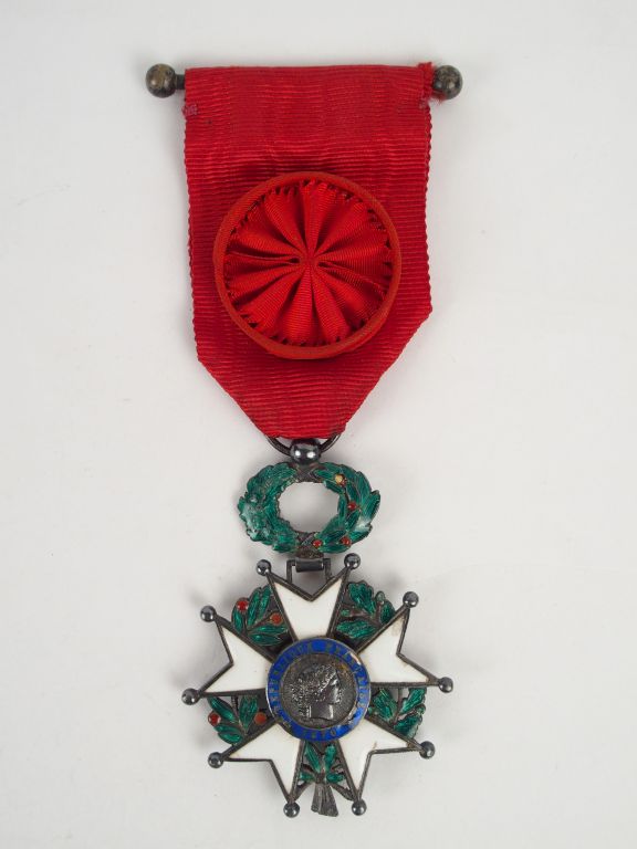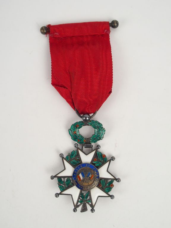 Etoile de chevalier de la légion d’honneur époque Troisième République, ruban à bouffette, éclats à l’émail autour des devises à l’avers et au revers.