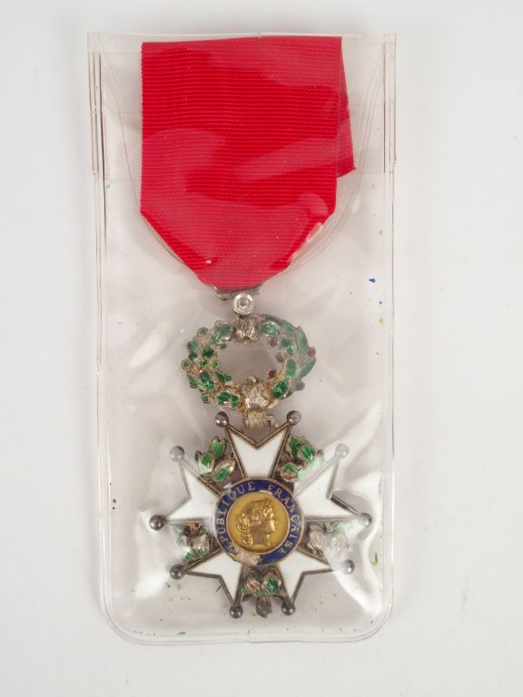 Etoile de chevalier de la légion d'honneur Troisième République à l'ordonnance du 8 Novembre 1870.Version de luxe bombée, Avers, centre or fond strié, tête de Marianne et texte "REPUBLIQUE FRANCAISE 1870" sur fond émaillé bleu,(manque) revers drapeaux tricolores croisés sur centre or et texte sur fond bleu "HONNEUR ET PATRIE", couronne de laurier argent émaillée et articulée épaisse. Avec son ruban.