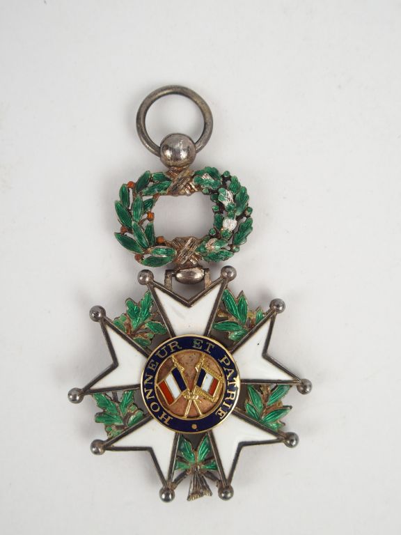 Etoile de chevalier de la légion d'honneur Troisième République (Demi-taille) à l'ordonnance du 8 Novembre 1870. Avers, centre or fond strié, tête de Marianne et texte "REPUBLIQUE FRANCAISE 1870" sur fond émaillé bleu, revers drapeaux tricolores croisés sur centre or et texte sur fond bleu "HONNEUR ET PATRIE", couronne de laurier argent émaillée et articulée. Sans ruban.