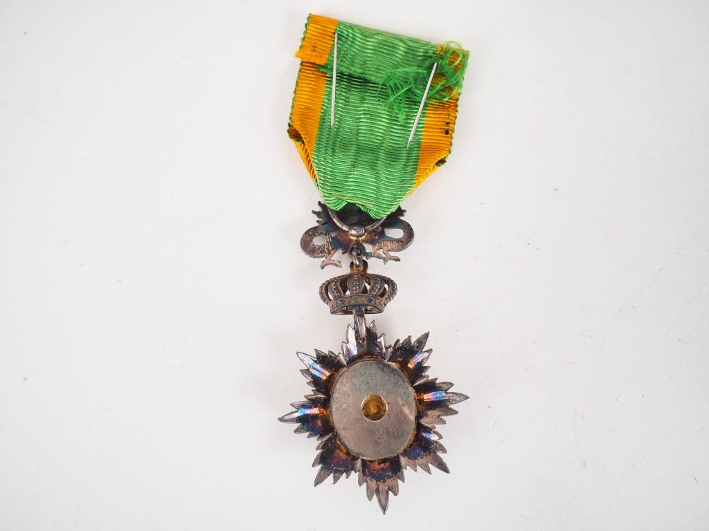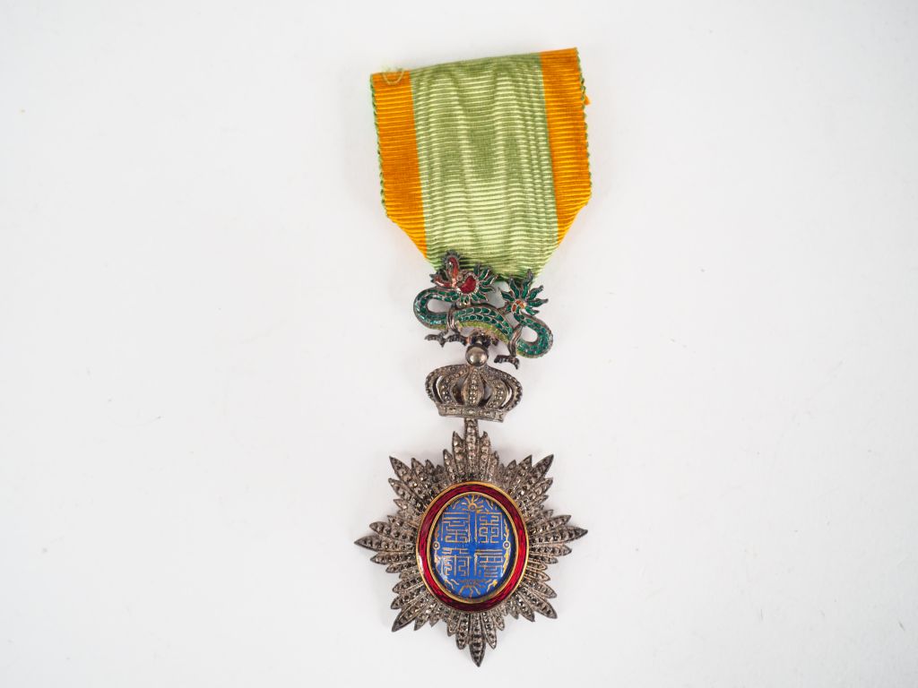 Etoile de Chevallier de l’ordre du dragon d’Annam à titre civil, beau bijou en métal argenté, bélière articulée à la couronne et au dragon émaillé. Avec son ruban vert pale à deux raies orange. (Etat 1)