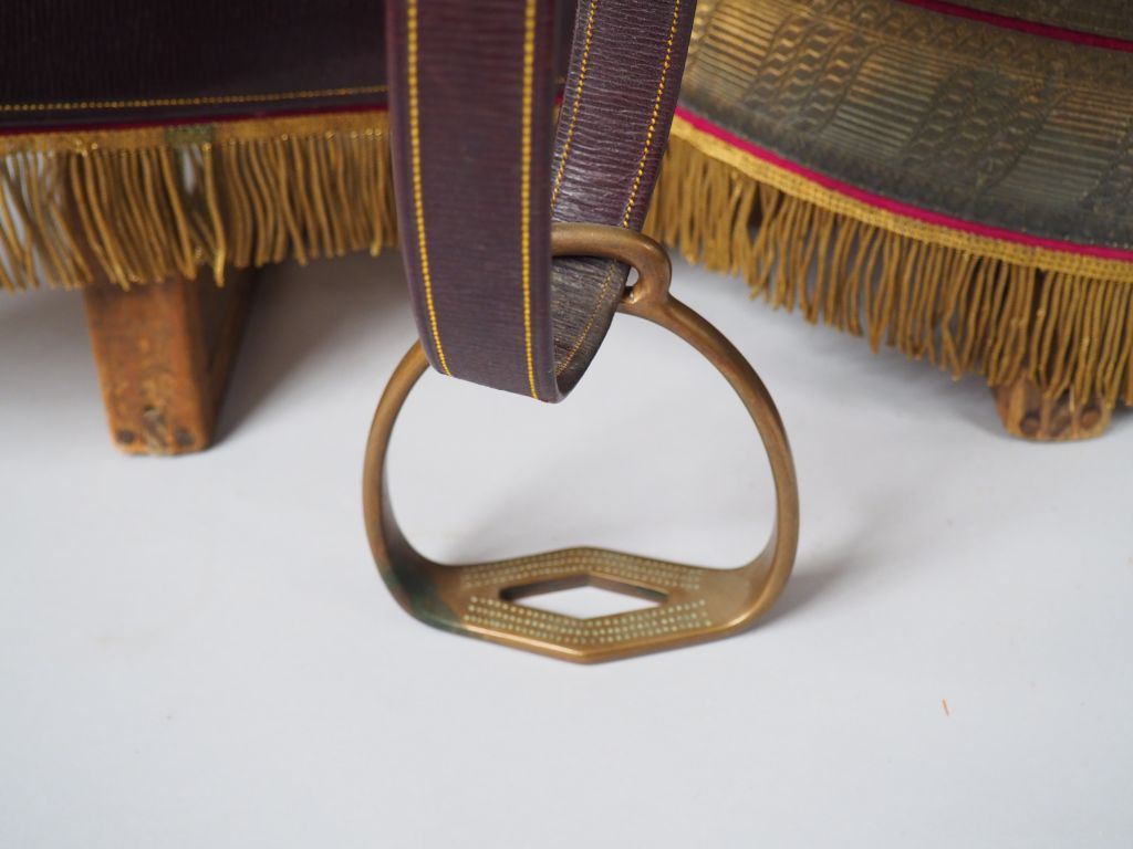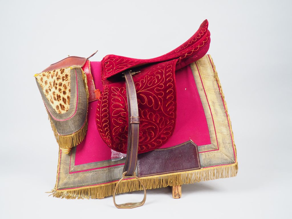 Exceptionnelle selle d’officier supérieur d’achat privé de qualité exceptionnelle, tapis de selle rouge ponceau à large double galon en passementerie dorée et franges de canetille d’or belle paire de fontes cuir à culot laiton doré et couvre-fontes habillée de peau de panthère et large galonnage double froncé en passementerie dorée sur canapé rouge insolé, des franges dorées en canetille surlignent les rabats des couvre-fontes. La selle habillée de velours cramoisi est rehaussée d’un décor cousu en fils dorés. Etat 1