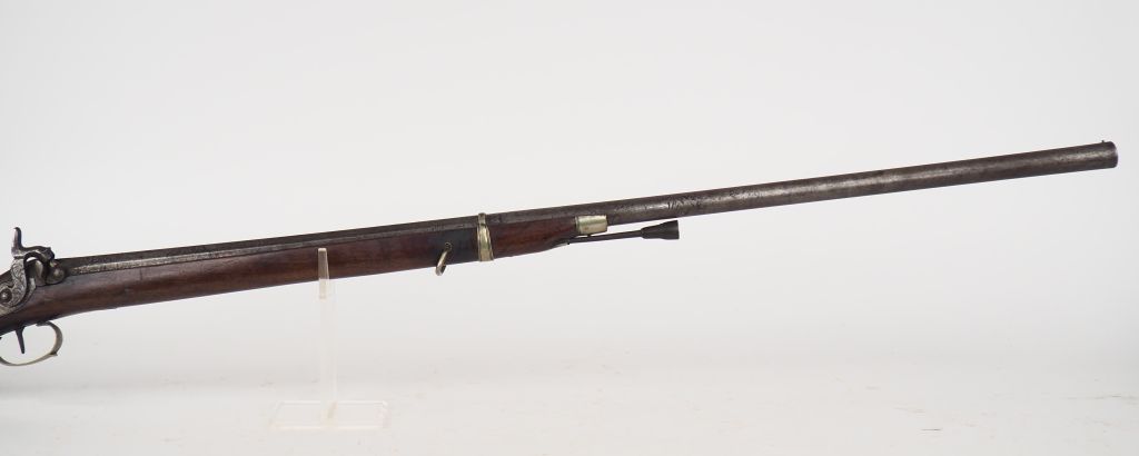 Fusil de chasse monocoup à percussion et platine à l'arrière par S.MEROLLA à NAPOLI, canon lisse octogonal au demi puis rond en damas au calibre de 14 balles à la livre. Arme montée maillechort, baguette fer traversant l'intégralité de la monture pour venir talonner la plaque de couche. Monture en noyer quadrillé à la poignée et s'arrêtant au demi du canon. Etat 2. cat. D