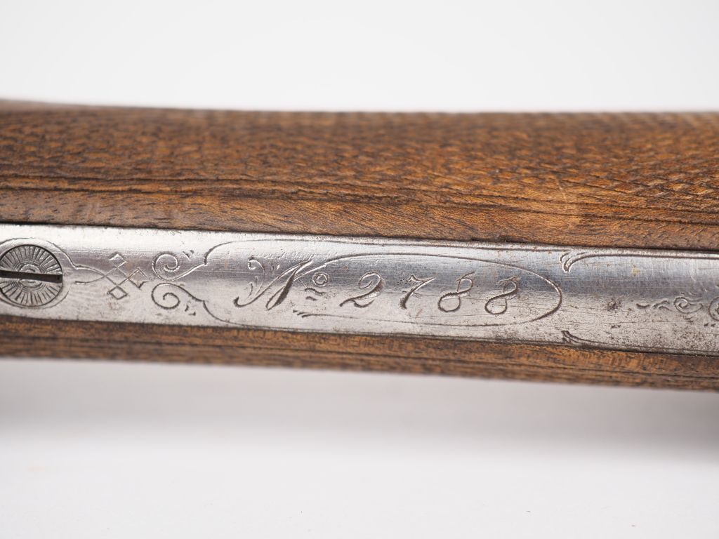 Fusil juxtaposé en calibre 12/65 systéme Anson et Delay à éjecteurs. Canons de 680 mm de long, polissage d'origine, diamétre à la bouche 18,3 mm à droite (Lisse) et 17,8 à gauche (Demi choke). Pas de jeu, bascule trempe grise gravée de volutes florales. Double détente, piston vitraux. Crosse anglaise de 370mm dont 20 mm de plaque en caoutchouc rouge. Avec sa bretelle, mécanisme fonctionnel.(Rebronzé) signature sur une plaque de recouvrement " FWarnier arquebusier à Paris".(Etat 1-). REF RGA : AS311-C24-2788