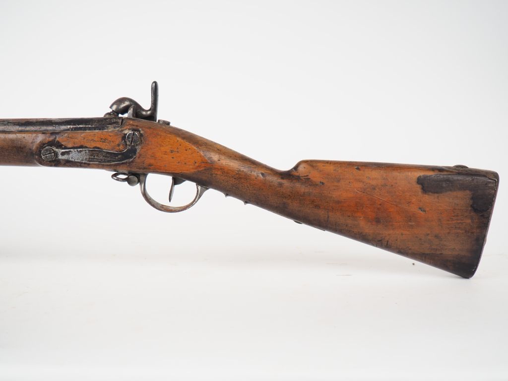 Fusil réglementaire d’infanterie à percussion Modèle 1822T de la Manufacture Royale de Tulle, canon daté 1833, cheminé sur masselotte. Crosse réceptionnée « Tulle ». Manque baguette, mécanisme fonctionnel. État 2.