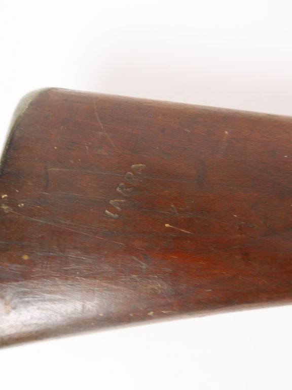 Fusil réglementaire Espagnol à silex, chien à la française à espalet avec "patilla" (pied faisant office de cran de gâchette) , platine à corps plat, bassinet laiton, toutes garnitures laiton arme de 1510 mm de long, long canon acier de 111 mm de long, un des pans de l'octogone au départ du canon porte la date 1806, marquage sur la monture en noyer au niveau du flanc du pied de vache de la crosse "LARRA". Mécanisme fonctionnel, manque la baguette! Arme de catégorie "D". (1)