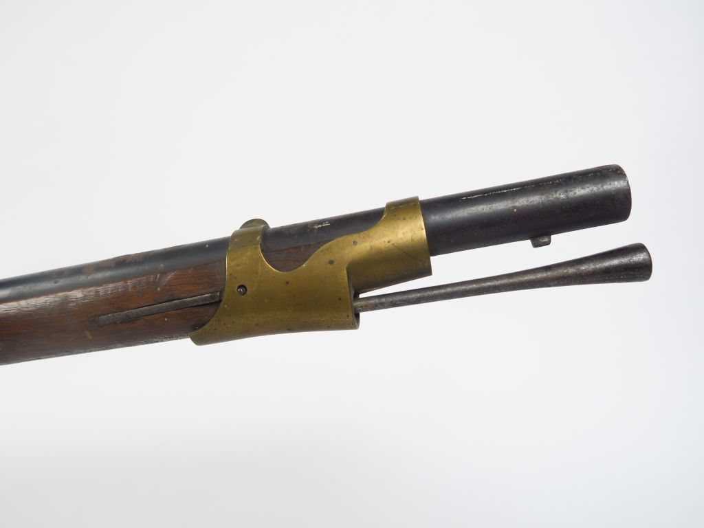 Fusil réglementaire Français anciennement à silex transformé à percussion, arme de 141 mm de long, canon lisse de 103 mm de long au calibre de munition, embouchoir laiton à guidon laiton, grenadière capucine, contre platine, pontet également en laiton plaque de couche fer. mis à silex par la pose d'une masselotte à l'emplacement du bassinet (restes dans la platine), chien dans le gout d'un chien de 1822T, pas de marquages, avec sa bretelle et sa baguette. Mécanisme fonctionnel. Arme de catégorie "D" (1-)