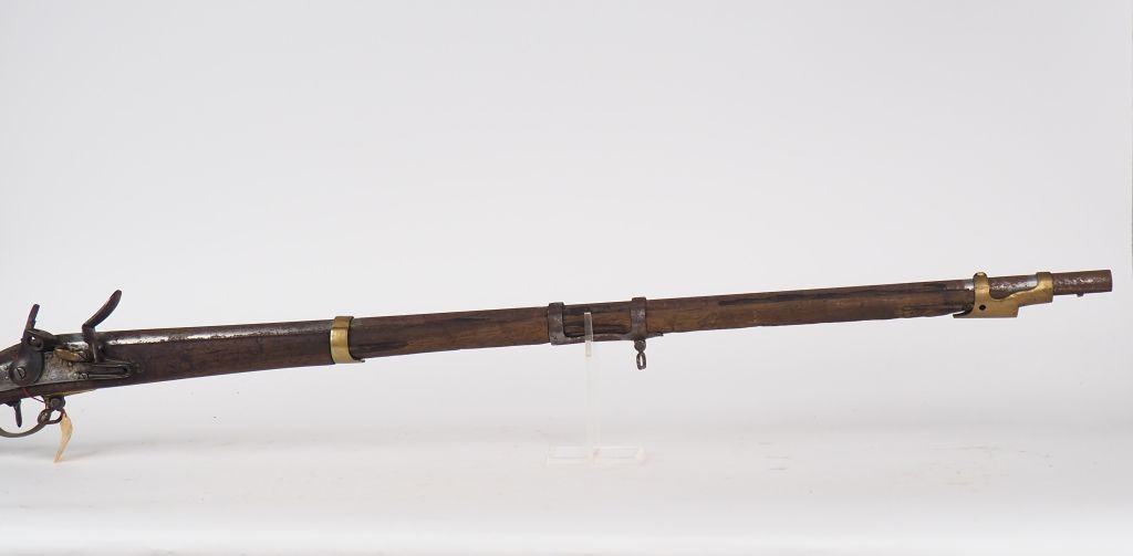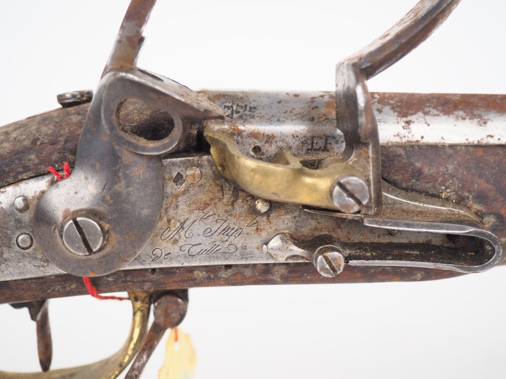 Fusil réglementaire Français de Dragon Modèle 1777/An IX, fabrication Manufacture Impériale de Tulle, canon daté 1815, mécanisme fonctionnel. Manque mâchoire supérieure, vis de mâchoire et baguette. Réplique d’embouchoir en laiton. État 2.