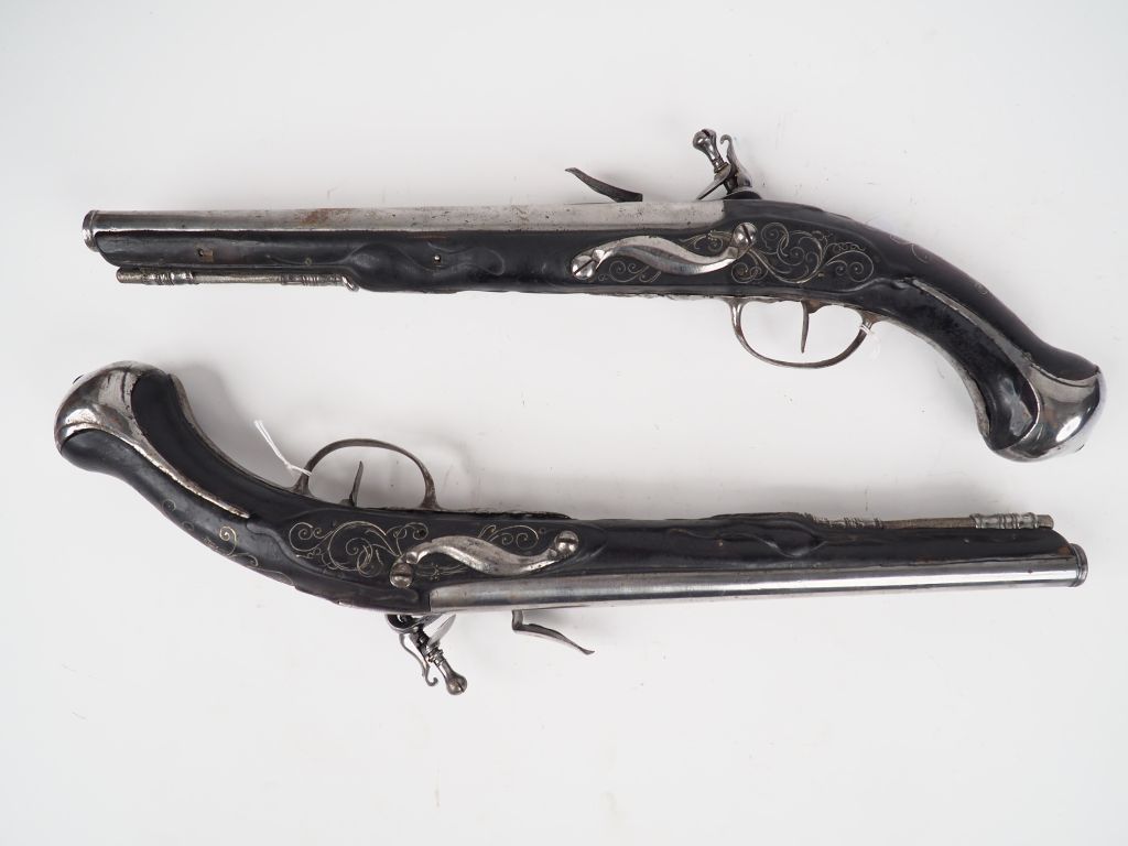Grande paire (450 mm de long) de pistolets d'Arçon à silex montés fer vers 1730 par « Drovin à Angers » comme indiqué par un discret marquage autour du galbe arrière du corps de chien. Canons ronds à bouche renforcée en calibre de 24 balles à la livre. Platines à corps ronds, bassinets fer ronds venue de coulée, batterie arrondie à nervure dorsale proéminente, chien col de cygne ronds. Pontet plat, détente droite, calotte à longues oreilles, montures en noyer sombre (enture très discrète à la tuile d'un des pistolets, réparation discrète sur l'autre) sculptées de reliefs surlignant les garnitures et portant au niveau habituel de la pièce de pouce une incrustation complexe de fis de cuivre et d’argent, on retrouve un motif semblable au niveau de la contre platine. Avec baguettes postérieures, mécanisme fonctionnel. Etat 1-.