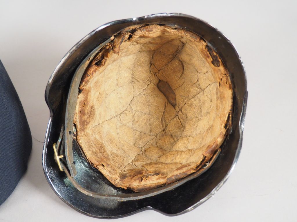 Intéressant ensemble composé d’une cuirasse et d’un pot de tête des sapeurs du génie, beau pot de tête modèle 1836, matelassure cousue couleur crème fixée par 12 rivets à contre rivets acier, jugulaire cuir à boucle laiton à un ardillon marquage « Couleaux à Klingenthal » et « 56 ». Bombe relaquée noir, la cuirasse composée de son plastron et de sa dossière est garnie d’une matelassure crème, signature « Couleaux F à Klingenthal » et nr « 293 » Ceinture et une bretelle d’épaulière et sa garniture postérieure. L’ensemble est relaqué noir. Etat 1-