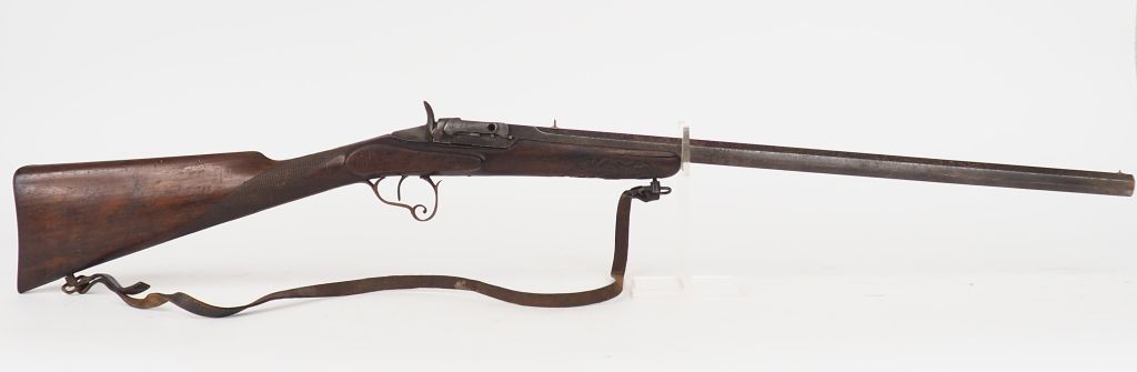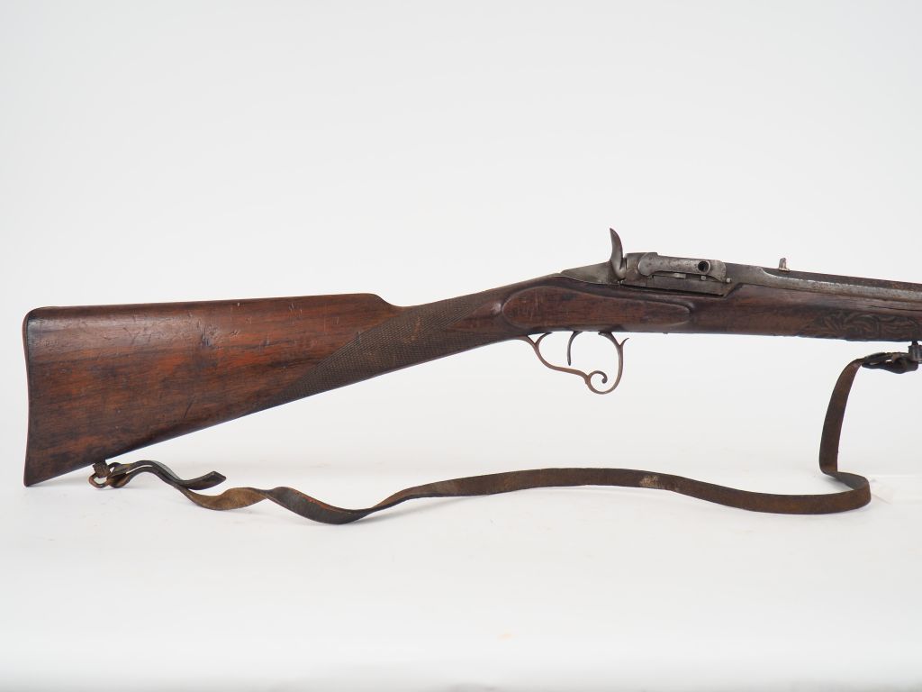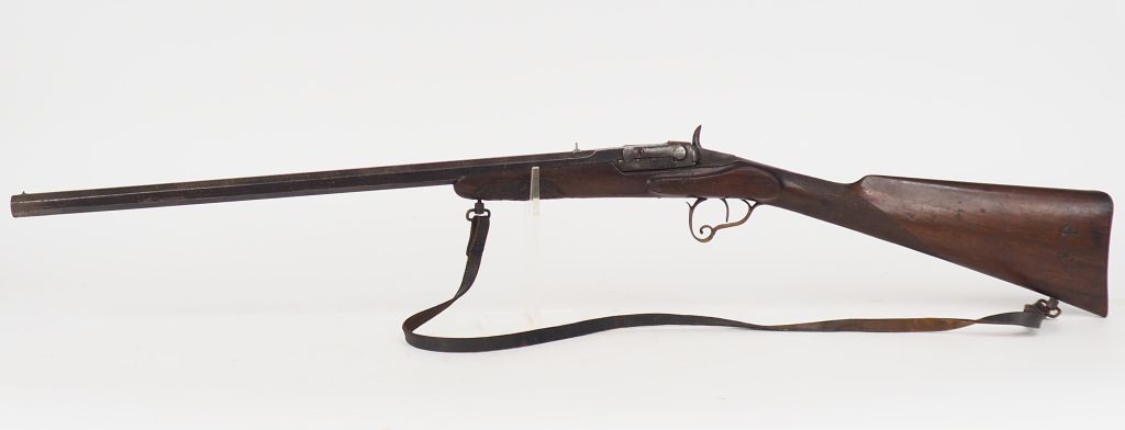 Intéressante carabine de jardin, système Warnant à coffre et à chien, culasse pivotant vers le haut. Fort canon octogonal : deux coups forés dans la masse du tube, alésage supérieur en 9 mm Flobert, alésage inférieur en 6 mm Flobert. Mono-détente, pontet à volute, crosse Anglaise en noyer quadriller à la poignée. Manque une vis de culasse. Mécanisme fonctionnel. État 1-.