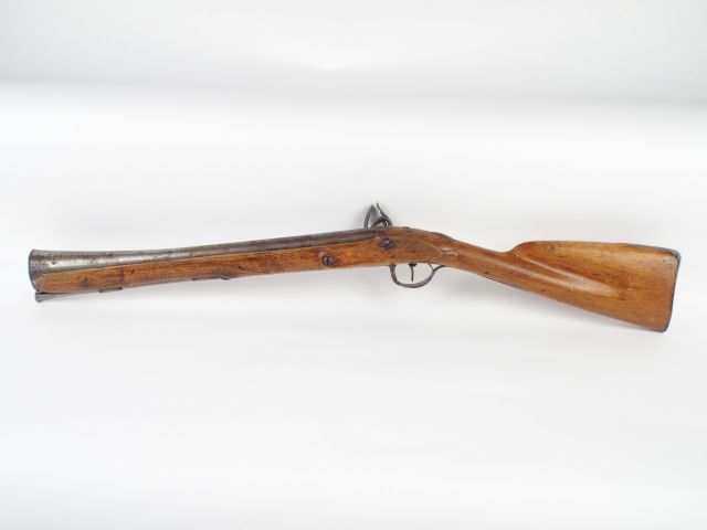 Joli tromblon à silex, platine fer, corps rond, bassinet rond fer, venu de forge, chien col de cygne (vis cassée, mâchoire supérieure présente), ressort de batterie vissé de l’intérieur. Arme monté fer, monture en noyer blond (accident) se prolongeant jusqu'à la bouche, canon rond en fer, baguette. Mécanisme fonctionnel. Mi 18éme. (2+)