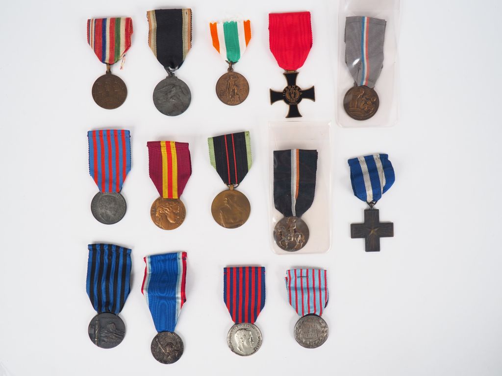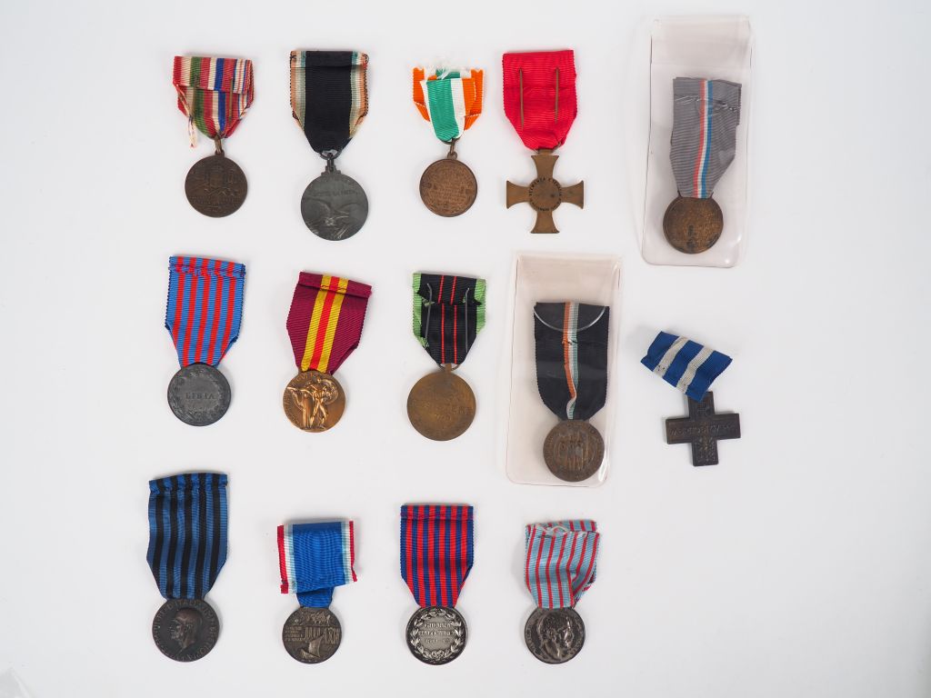 Lot de 14 décorations italiennes diverses dont deux médailles de la guerre turco-italienne de 1912 et la campagne royale de conquête de la Libye avec leurs rubans spécifiques. (Etat 1-)