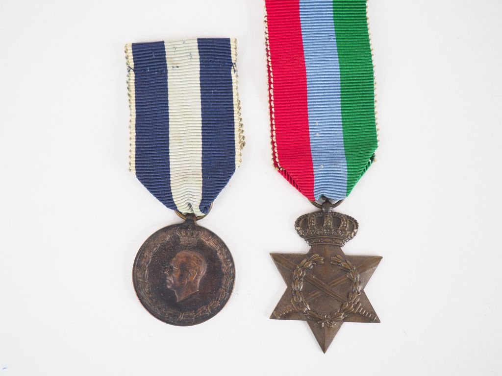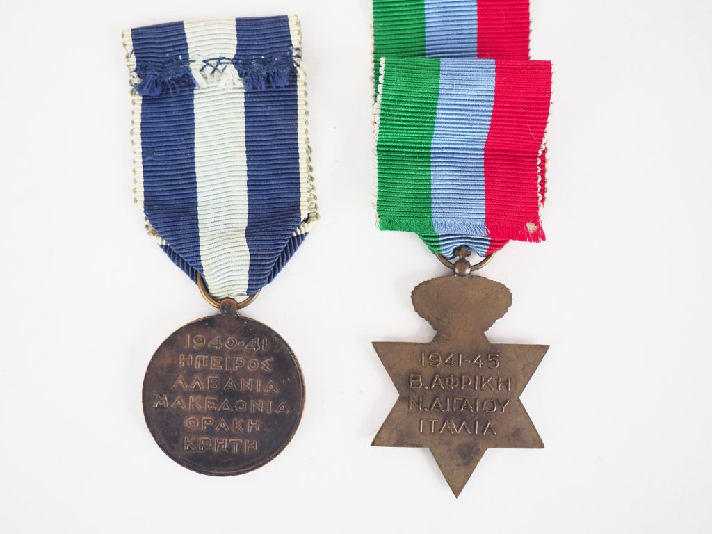 Lot de 2 décorations commémoratives grecques dont une étoile commémorative de la campagne de 1941 à 1945 et une médaille honorant les combattants de la période 1940/1941 avec leurs rubans spécifiques. (Etat 1)
