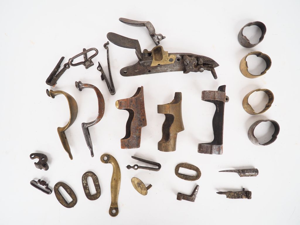 Lot de 3 garnitures pour fusils réglementaires français, on y trouve un embouchoir et une double bande pour fusil de dragon modèle an IX. On y joint une ébauche d’embouchoir en laiton et un lot important de garnitures pour fusils réglementaires (capucine fer et laiton, pontet fer et laiton, ressort de batterie, batterie, corps de platine, vis et divers…) Etat 2.