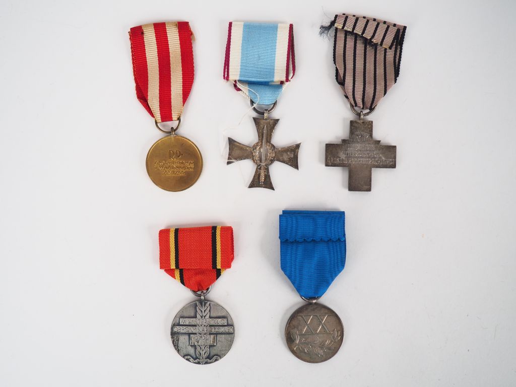 Lot de 5 décorations polonaises dont médaille des Déportés(Croix d'Auschwitz) (Krzyz Oswiecimski) avec son ruban au couleur des tenues de déporté, médaille de la participation à la bataille de Berlin, mérite en Silésie (1921) victoire et liberté et divers. (Etat 1)