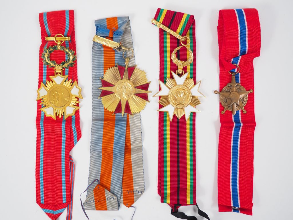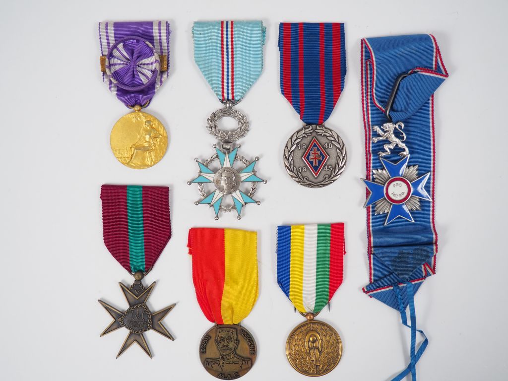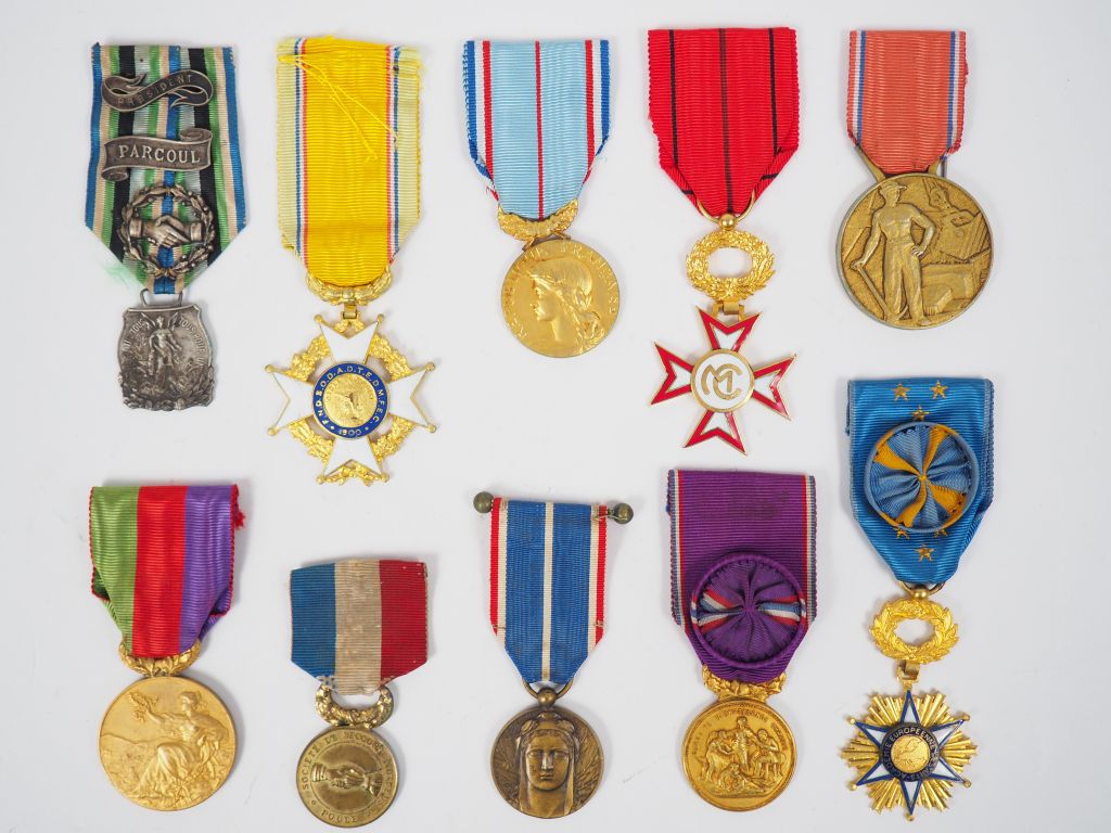 Lot de 85 médailles et brassards dont : - brassards : SNCF bicolore, réquistion nationale, croix rouge… - étoiles du mérite, diverses croix du mérite, - médailles commémoratives et d'associations. On y joint diverses croix et réductions avec ou sans bouffette du mouvement de résistance combat du mérite international, décoration nominative des travaux publics de France, une décoration de la société industrielle de Rouen, médaille or et argent du dévouement national, diverses décorations dont Académie européenne des Arts (avec et sans bouffette), décorations au parcours sportif des sapeurs pompiers (beaucoup de médailles de secours), médaille d'honneur des services bénévoles, étoile du devoir français, association des anciens de la première division libre, médaille pendante de l'Association Vosgienne des anciens combattants (buste de Liauthey)