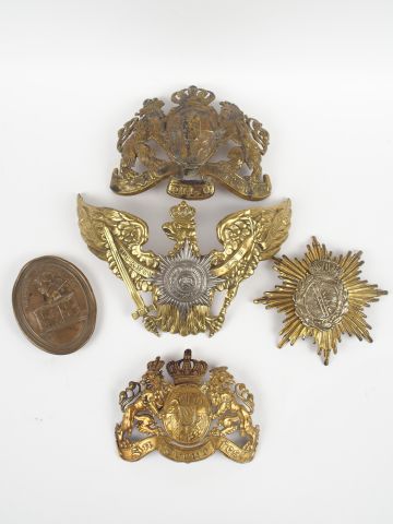 Lot de cuivreries diverses plaques de casque à pointe (Bavière 1896, et un autre modèle), garde Prussienne, Saxe, une pointe 1895 et une plaque de la banque de France. 1-.