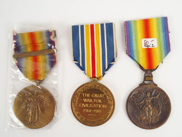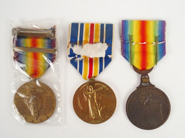 Lot de médailles interalliées comprenant: une grecque, une U.S barrette "Defensive sector", une britannique avec leurs rubans arc en ciel. 1