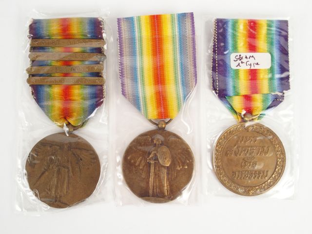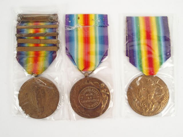 Lot de médailles interalliées comprenant: une siamoise (1er type oreille de la divinité visible), une française non officielle version "Pautot-Mattei" et une U.S. avec 4 barrettes Avec leurs rubans arc en ciel. 1