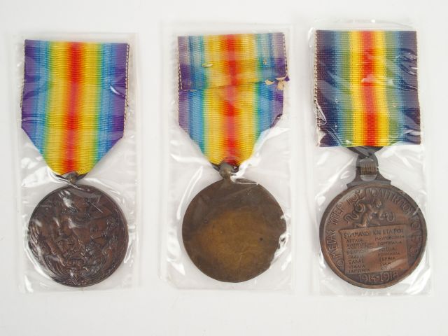 Lot de médailles interalliées une siamoise (2 eme type oreille de la divinité non visible), une française non officielle version "Dubois" uniface et une grecque avec leurs rubans arc en ciel. 1.