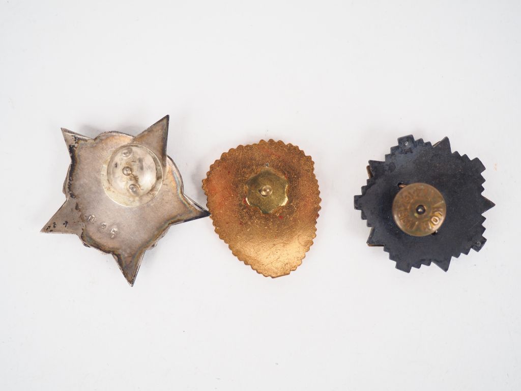 Lot de trois décorations du bloc de l’est post 1945 dont étoile émaillée rouge sur fond rayonnant, insigne roumain « MILITAR DE FRUNTE » et belle étoile pectorale d’argent montage à vis de partizan tchécoslovaque avec petit numéro d’attribution « 37 ». (Etat 1-)
