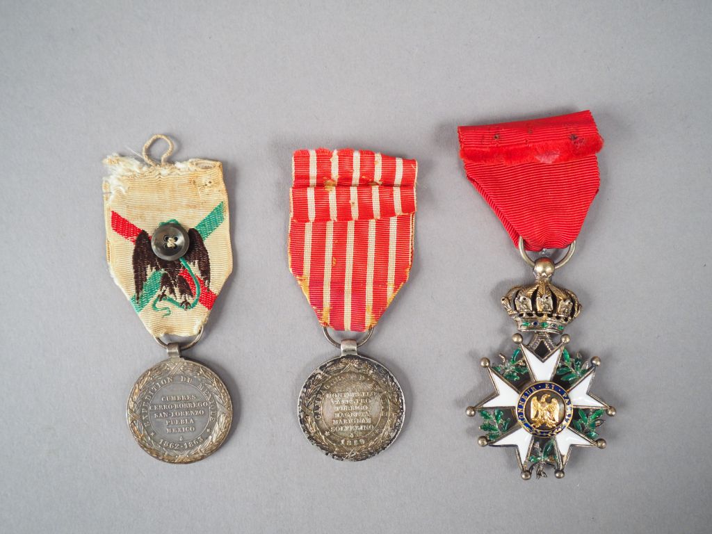 Lot de trois décorations époque Second Empire avec leur ruban. On y trouve une médaille de la campagne d’Italie (signée Barre) avec ruban rouge à raies blanches, une médaille commémorative de la campagne du Mexique avec son bon ruban blanc barré de rouge et de vert à l’aigle Mexicain tenant un serpent dans son bec. On y joint une croix de Chevalier de la Légion d’Honneur Second Empire, couronne mobile avec aigles aux fleurons de la couronne avec perles vertes et bleues, ruban rouge de feu (quelques manques à l’émail blanc d’une pointe au revers). Etat 1-