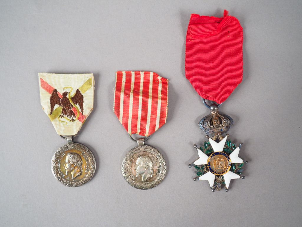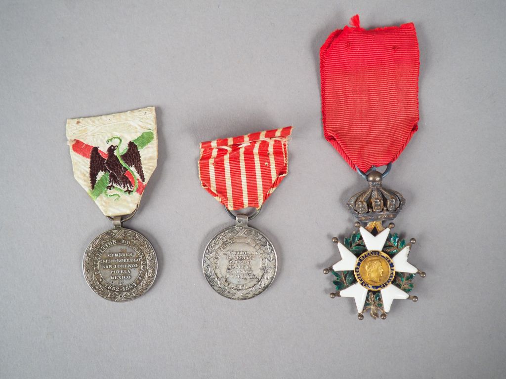 Lot de trois décorations époque Second Empire avec leur ruban. On y trouve une médaille de la campagne d’Italie (signée Barre) avec ruban rouge à raies blanches, une médaille commémorative de la campagne du Mexique avec son bon ruban blanc barré de rouge et de vert à l’aigle Mexicain tenant un serpent dans son bec. On y joint une croix de Chevalier de la Légion d’Honneur Second Empire, couronne mobile avec aigles aux fleurons de la couronne, ruban rouge de feu (quelques éclats en manque à l’émail des branches et aux centres). Etat 1-