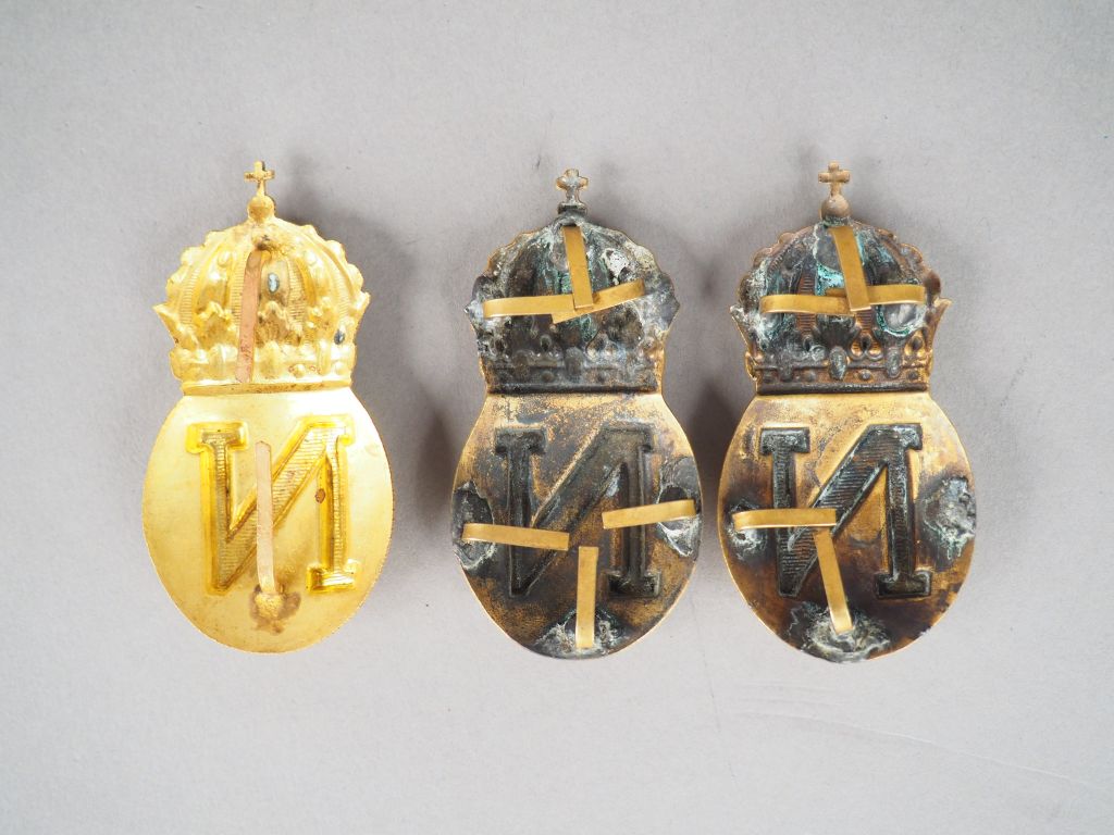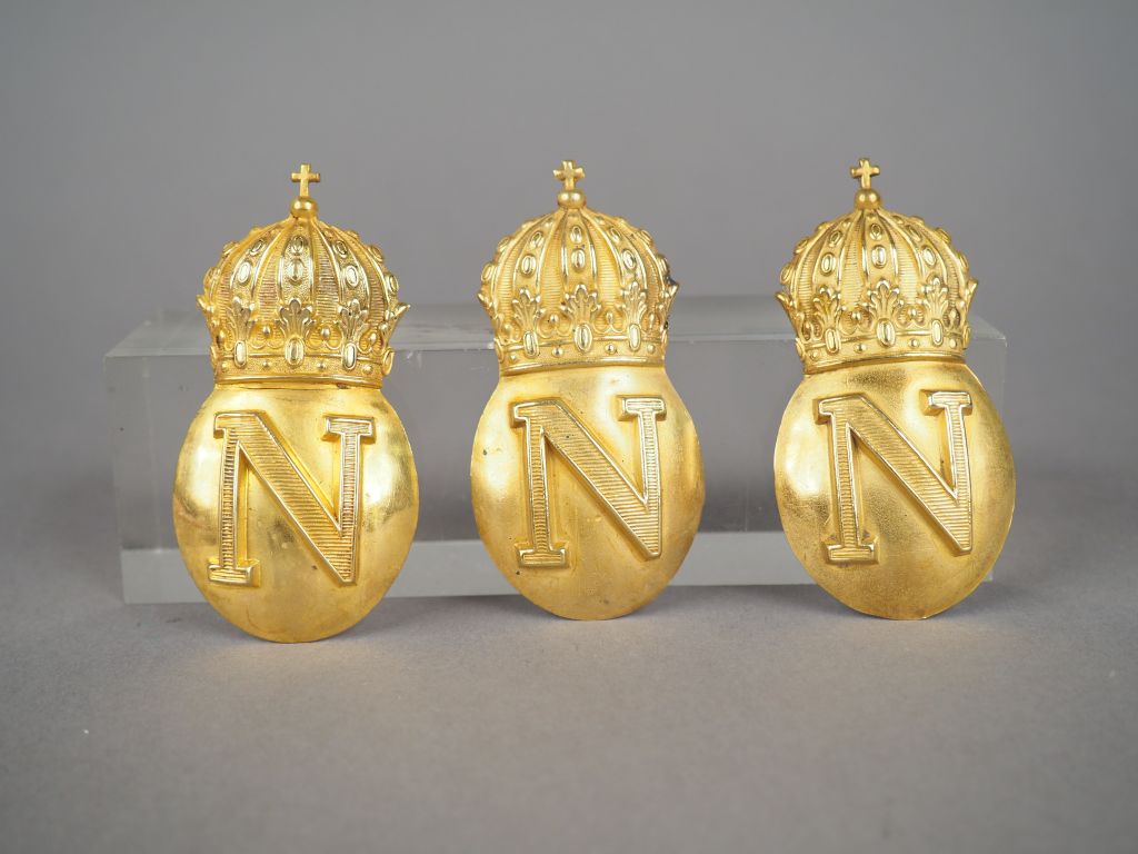 Lot de trois ornements de croupières de guides de la Garde impériale (harnachement de cavalerie). Sphère en relief en laiton embossé, portant un grand « N » couronné, pattes de fixation au dos, deux modèles de pattes (70 x 35 mm) Etat 1