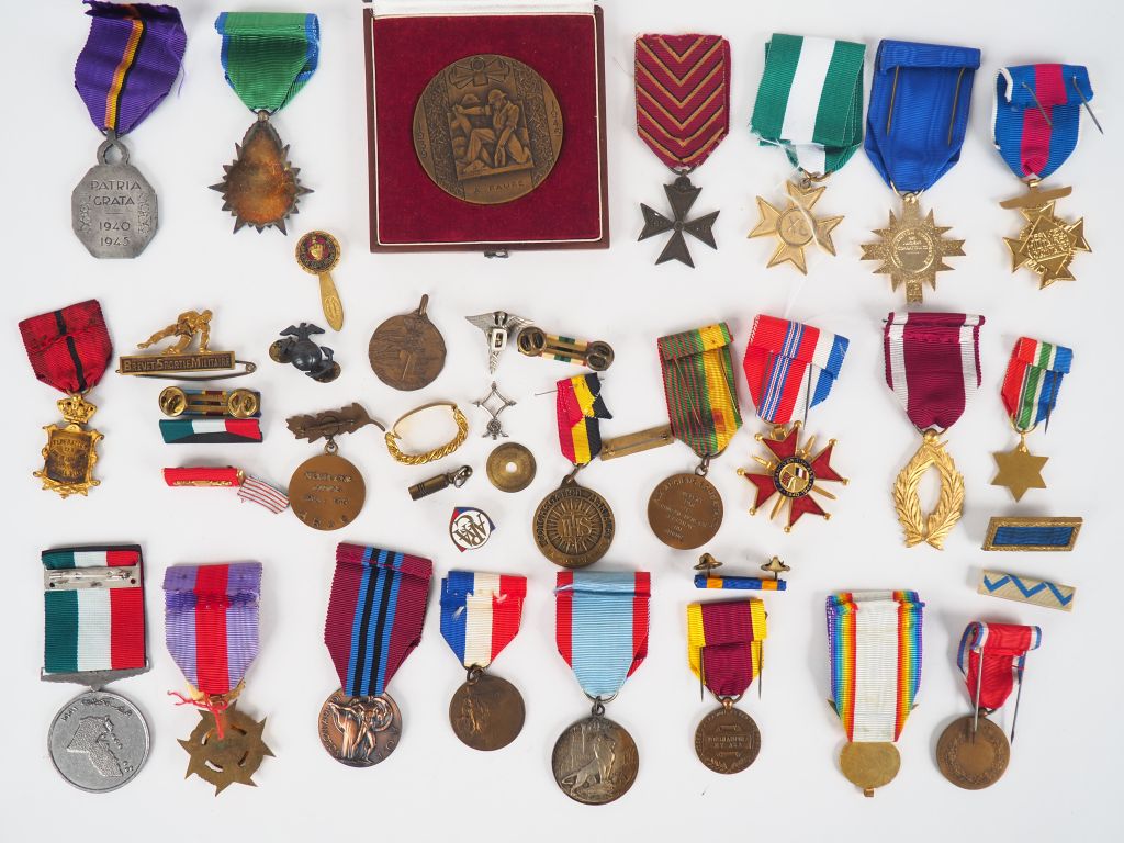 Lot d’une vingtaine de décorations pendantes avec leur ruban spécifique tant française qu’internationale certaines non officielles dont réduction et une médaille de table en boite. Lot idéal pour un revendeur en vide grenier ou sur internet ou jeune collectionneur débutant dans le monde complexe de la phaléristique. (Etat 1)