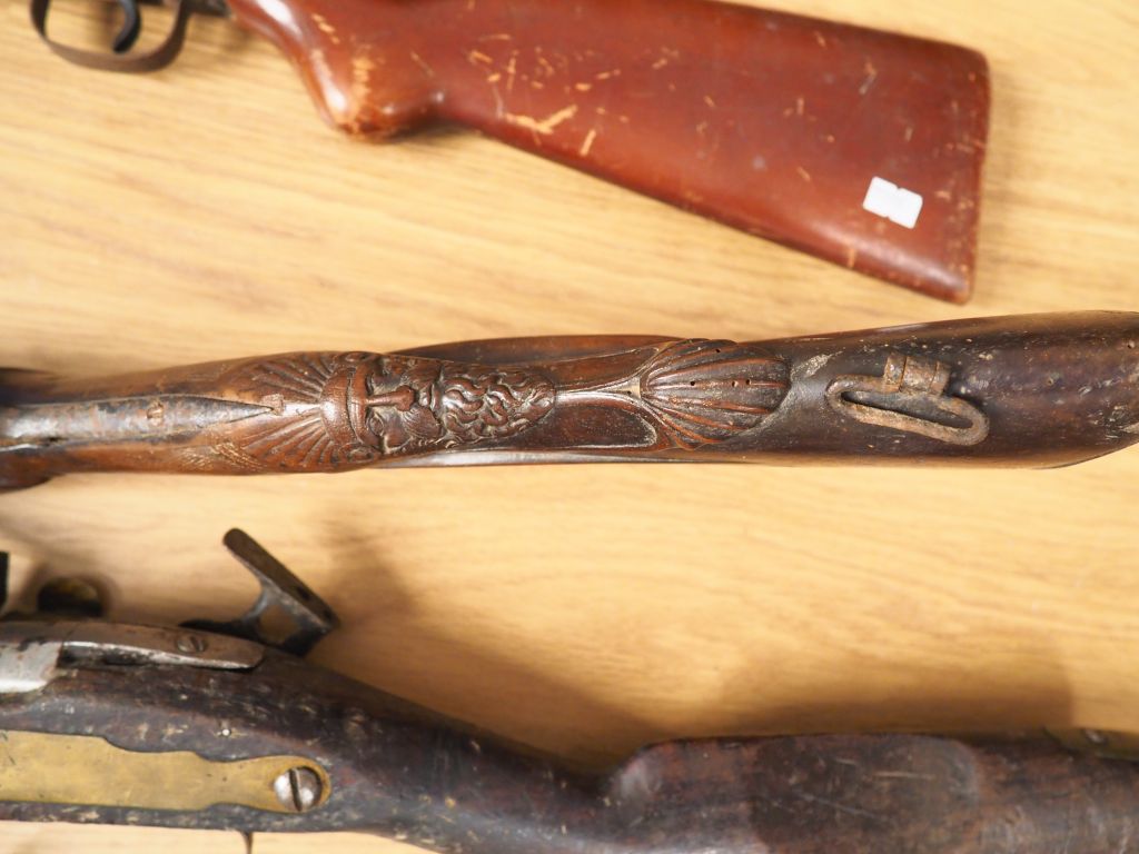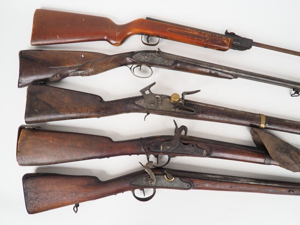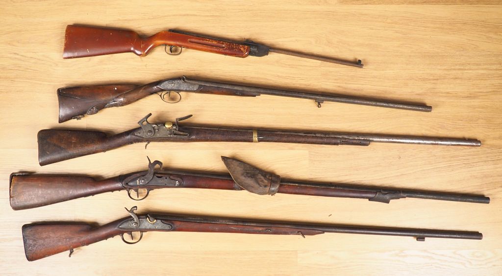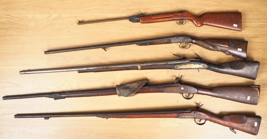 Lot pour collectionneur débutant, amateur de restauration ou vendeur en vide grenier comprenant cinq armes longues diverses. On y trouve deux fusils de traites monocoup à percussion, un fusil réglementaire à silex étranger, un fusil de chasse double à percussion (manque chiens) et une carabine à air comprimé (compression non garantie). État 3.