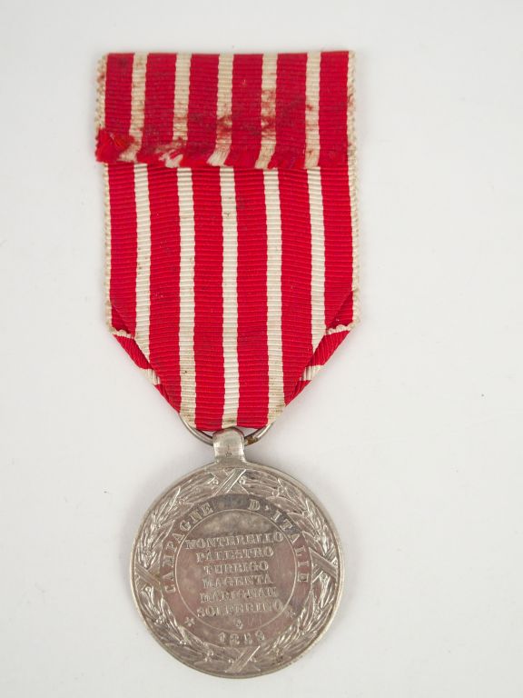 Médaille commémorative de l’expédition d'Italie (1859), attribuée aux 120 000 hommes du corps expéditionnaire, module argent signé « Barre » tête de l'empereur à l'avers, revers portant sur le pourtour "CAMPAGNE D'Italie 1859" et le nom des batailles "MONTEBELLO-PALESTRO-TURBIGO-MAGENTA-MARIGNAN-SOLFERINO", ruban rouge à fines rayures blanches.