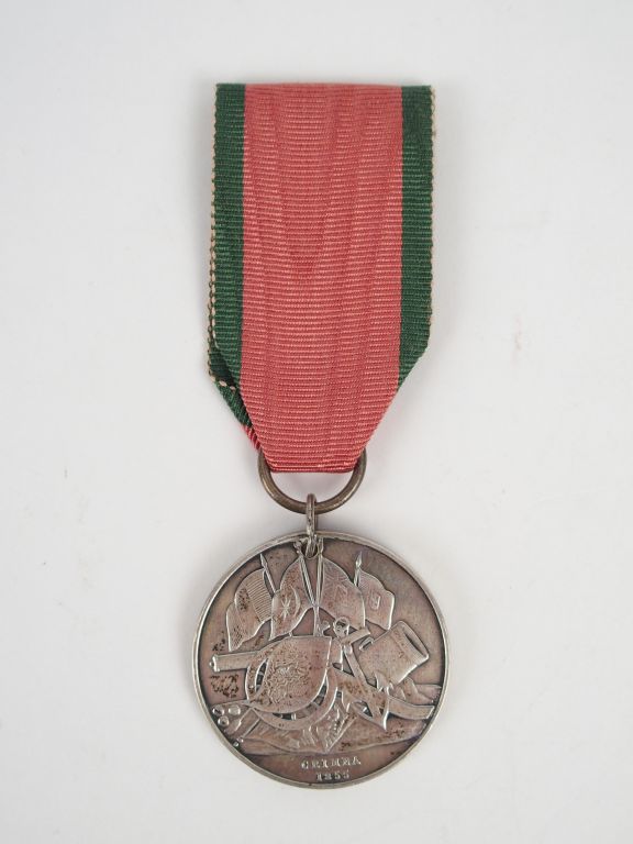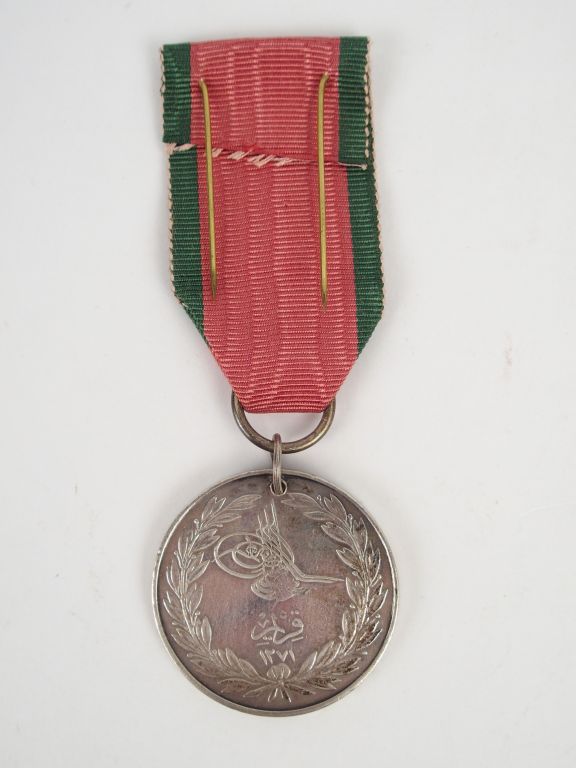 Médaille de Crimée turque pour un combattant anglais (drapeau Anglais à droite du drapeau turc), module rond argent, Pontet anneau. Avers canon, faisceau et 4 drapeaux, marquage en bas "Criméa 1855", revers Tougrah du sultan et date 1271. Ruban rouge à fine rayures vertes à l'extérieur. (Médaille rare, la plupart des décorations destinées au corps expéditionnaire de sa très gracieuse majesté ayant disparu dans un naufrage).