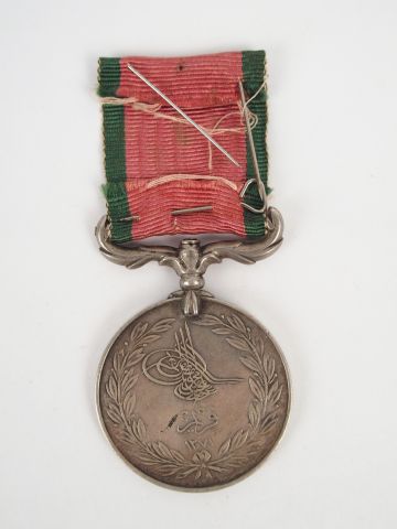 Médaille de Crimée turque pour un combattant Français, module rond argent, Pontet floral pivotant. Avers canon, faisceau et 4 drapeaux (drapeau Français à droite du drapeau Turc), marquage en bas "La Crimée 1855", revers Tougrah du sultan et date 1271. Ruban rouge à fine rayures vertes à l'extérieur. 1.