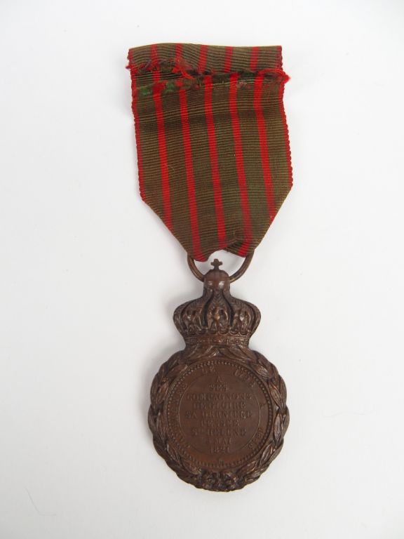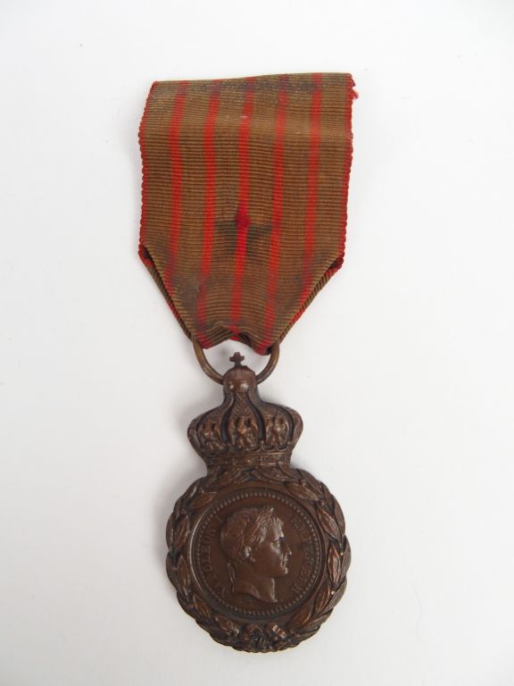 Médaille de Sainte Hélène, remise sous le régime de Napoléon III aux survivants des campagnes de 1792 à 1815. Cette belle médaille en bronze porte sur son avers la tête couronnée de Napoléon 1er dans une couronne de Laurier surmonté d’une couronne portant l’anneau de suspension. Au revers se trouve le texte « CAMPAGNES DE 1792 à 1815 » et au centre la phrase « A SES COMPAGNONS DE GLOIRE SA DERNIERE PENSEE ST HELENE 5 MAI 1821 »Ruban Vert à rayures framboise (insolé).