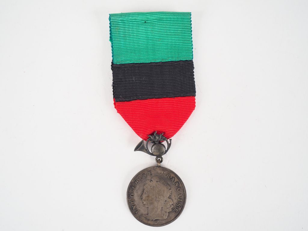 Médaille française des douanes, module rond argenté profil de Marianne à l’avers, « douanes et régies- honneur et mérite » au revers, avec son ruban à trois raies horizontales verte/noire/rouge. (Etat 1)