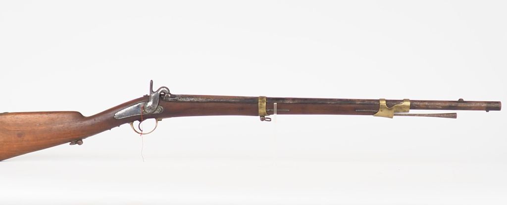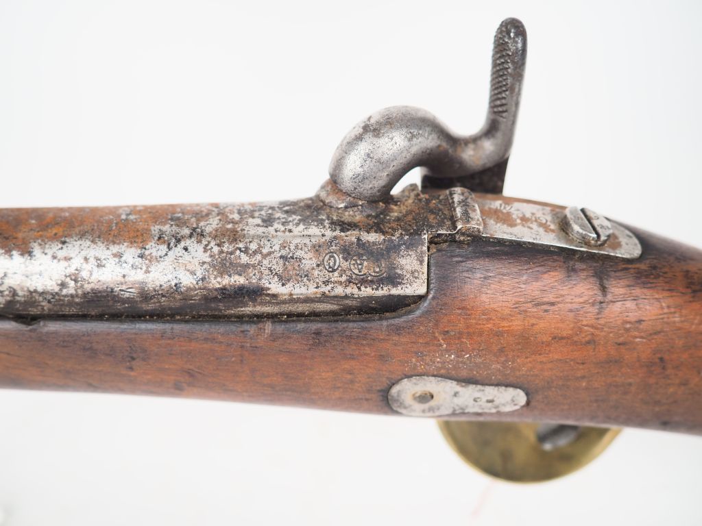 Mousqueton de Gendarmerie à percussion Modèle 1842. Platine à l’arrière marquée « Manufacture Royale de Tulle ». Eclat de bois entre la queue de culasse et le corps de platine. Hausse supprimée. Baguette non conforme. Mécanisme fonctionnel. État 2.