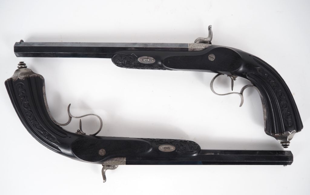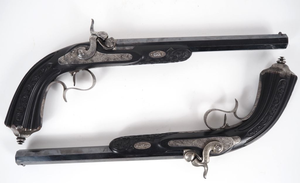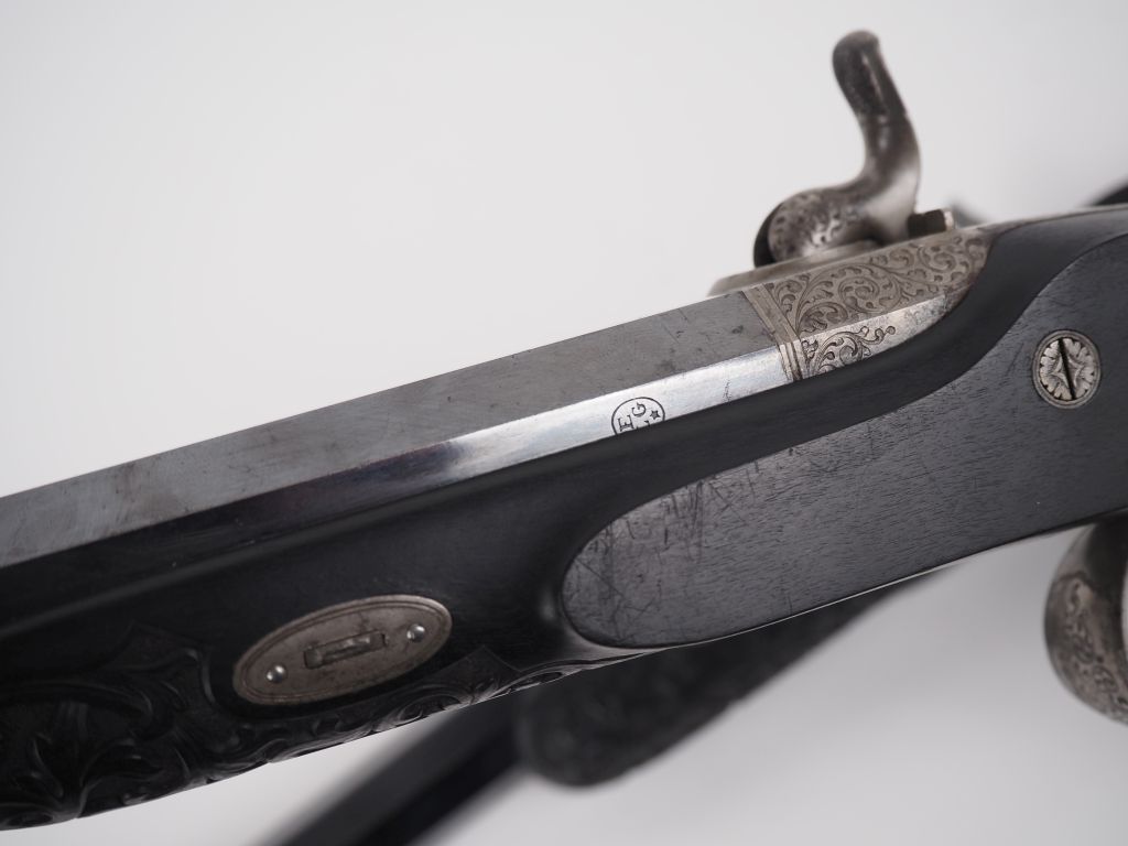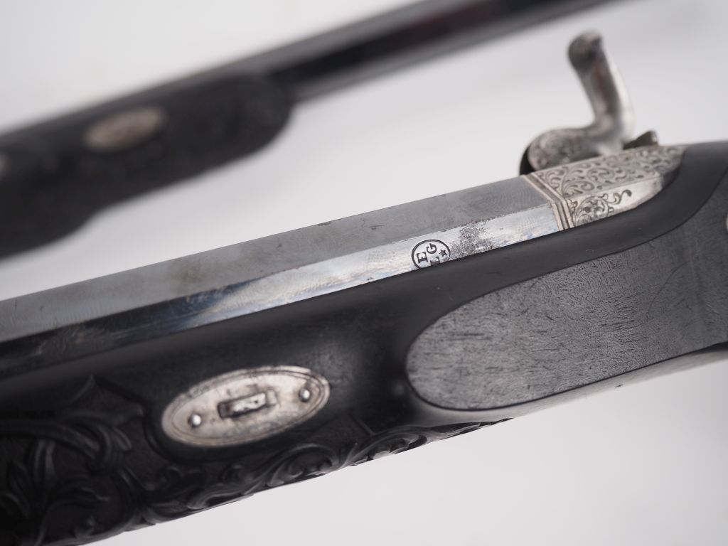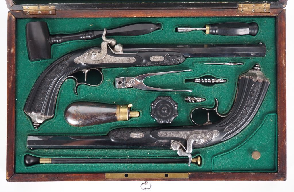 Paire de pistolets d’officier à percussion. Canons à pans bleuis, rayés, numérotés aux tonnerres. Platines avants et chiens gravés de rinceaux feuillagés. Queues de détente avec vis de sensibilité. Crosses en ébène sculpté de rinceaux feuillagés. A.B.E. (Petites traces d’oxydation) Fabrication liégeoise, vers 1830-1840. Présentés dans un coffret plaqué de noyer avec motif de couvercle et entrée de serrure en laiton, gainé (postérieurement) de feutre vert avec des accessoires : Maillet, tournevis démonte cheminée, débouche lumière, baguettes avec deux embouts, moule à balle, boîte à capsules, poire à poudre en cuivre et laiton. Avec sa clé. Dimensions : 47 x 28,5 cm Expert : Arnaud de Gouvion Saint-Cyr Expert en souvenirs militaires et historiques, armes anciennes et ordres de chevalerie. Membre du Syndicat français des experts professionnels. 06.70.75.01.05