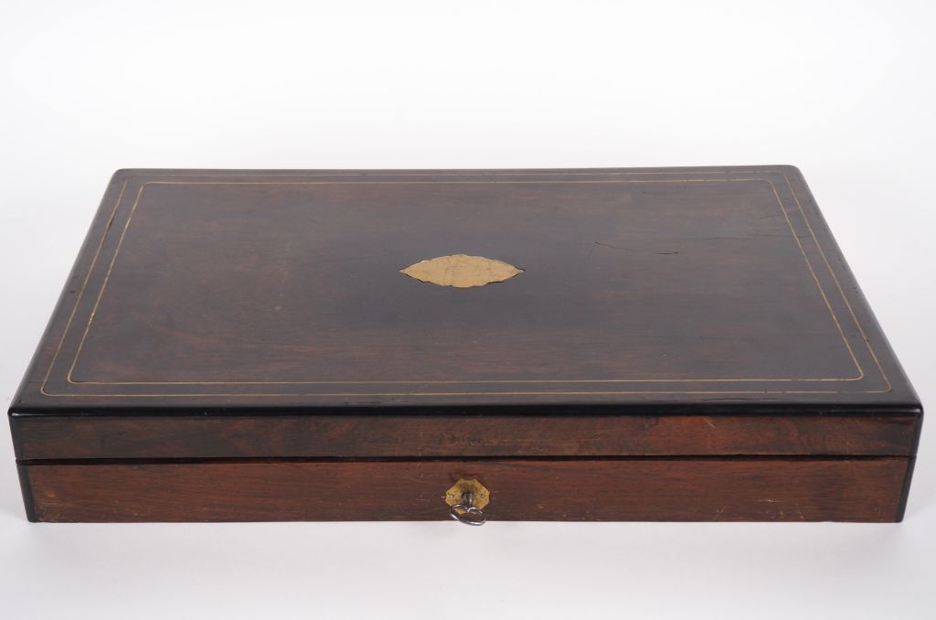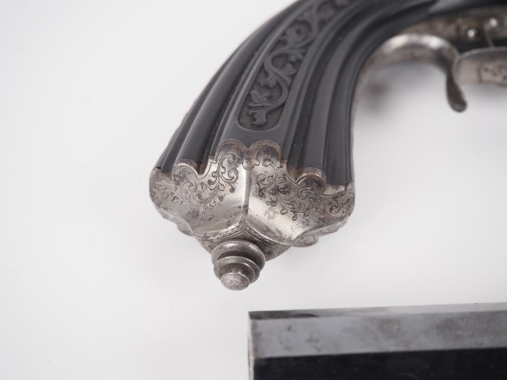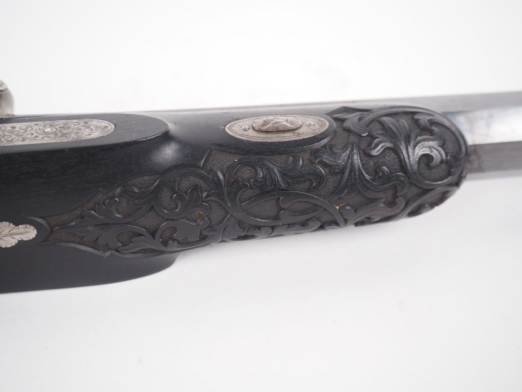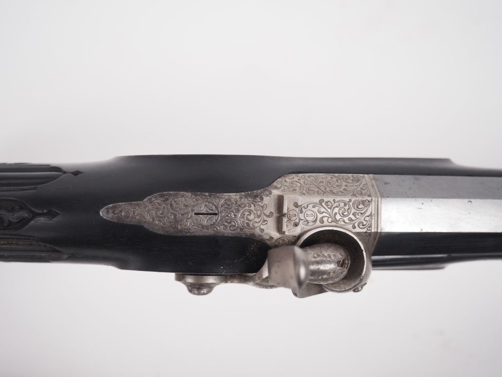 Paire de pistolets d’officier à percussion. Canons à pans bleuis, rayés, numérotés aux tonnerres. Platines avants et chiens gravés de rinceaux feuillagés. Queues de détente avec vis de sensibilité. Crosses en ébène sculpté de rinceaux feuillagés. A.B.E. (Petites traces d’oxydation) Fabrication liégeoise, vers 1830-1840. Présentés dans un coffret plaqué de noyer avec motif de couvercle et entrée de serrure en laiton, gainé (postérieurement) de feutre vert avec des accessoires : Maillet, tournevis démonte cheminée, débouche lumière, baguettes avec deux embouts, moule à balle, boîte à capsules, poire à poudre en cuivre et laiton. Avec sa clé. Dimensions : 47 x 28,5 cm Expert : Arnaud de Gouvion Saint-Cyr Expert en souvenirs militaires et historiques, armes anciennes et ordres de chevalerie. Membre du Syndicat français des experts professionnels. 06.70.75.01.05