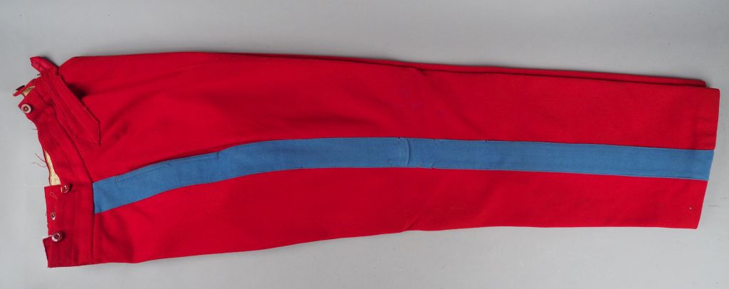 Pantalon droit en drap garance, large bande bleu ciel (cavalerie légère) Troisième République, martingale de serrage, bouton cuvette en bakélite peints en rouge. Etat 1-