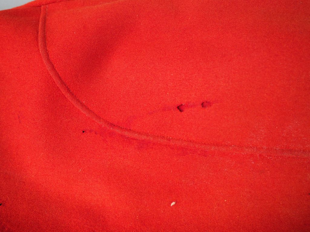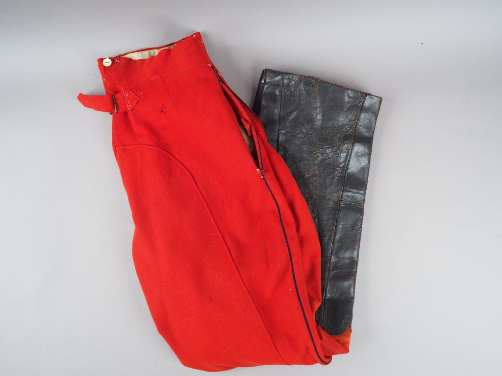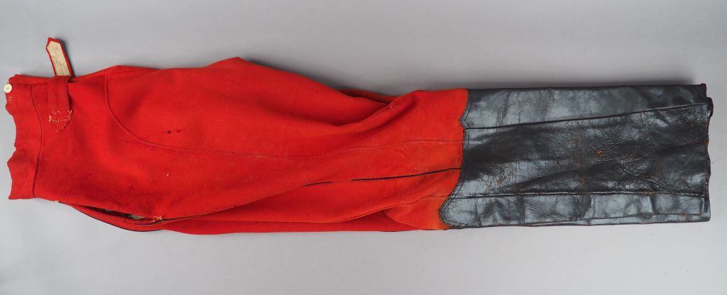Pantalon troupe à basane réglementaire drap garance, passepoil noir, cuir de la basane noir souple, doublure en drap crème tamponnée et matriculée (illisible). Usure d'usage, en très bon état (quelques morsures de mites). Etat 2