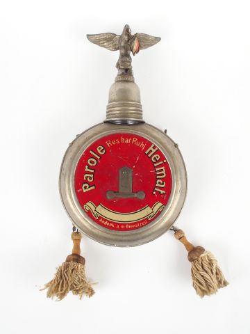 Petite gourde à Schnaps de réserviste en verre habillée de tôle, décor peint sur fond rouge « PAROLE HEIMAT » sur une face et scènes de la vie militaire sur l’autre face en couronne autour d’un regard laissant voir le contenu de la flasque. Bouchon en métal blanc surmonté de l’aigle prussien. 1.