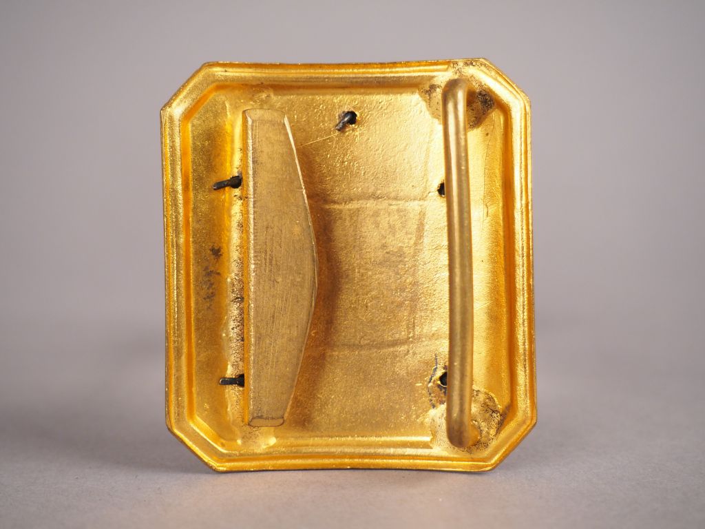 Plaque de ceinturon d’officier de la Garde Nationale rectangulaire bombée, à pans coupés en laiton doré embouti, aigle non couronné tête à droite sur foudres. Présidence (60mm x 55mm). Etat 1