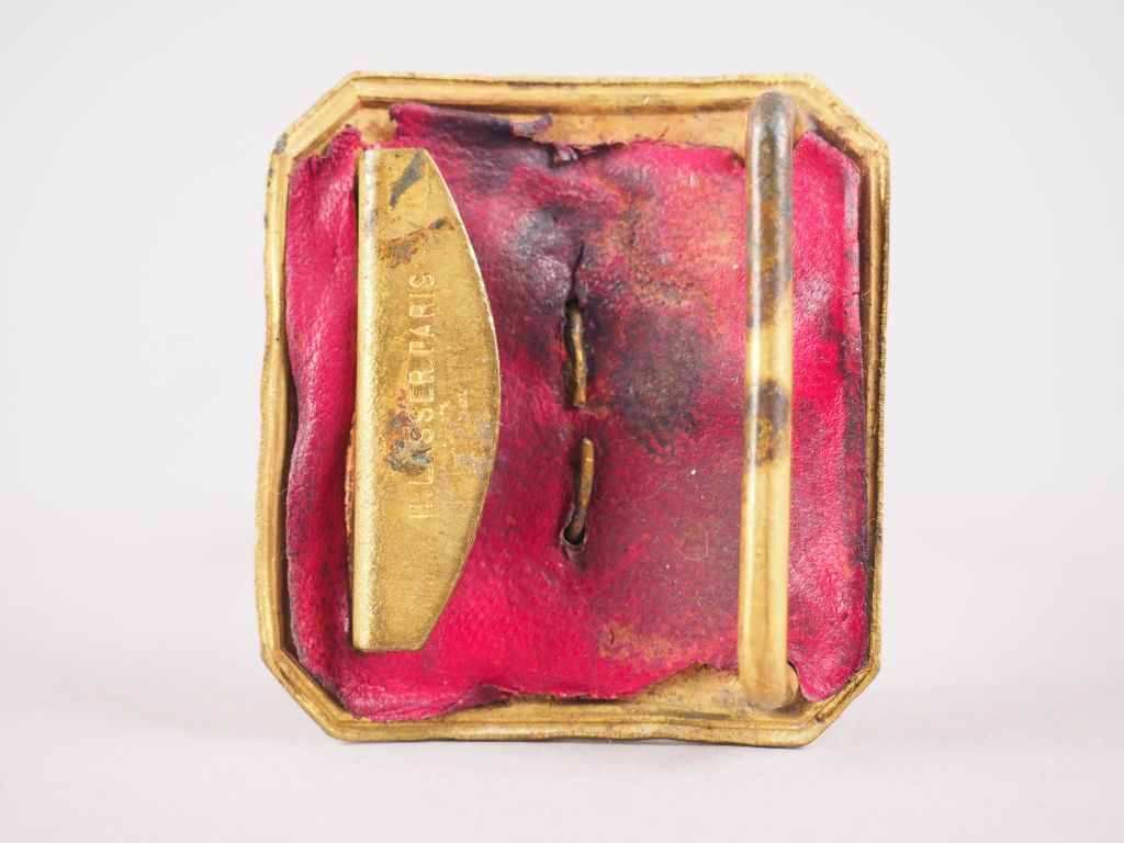Plaque de ceinturon rectangulaire bombée à pans coupés en laiton doré embouti pour sous-officier d’infanterie. Mod 1852. Grenade flammée embossée dans la plaque, crochet marqué « H . LASSER PARIS », sous plaque en maroquin rouge (60mmx65mm). Etat 1
