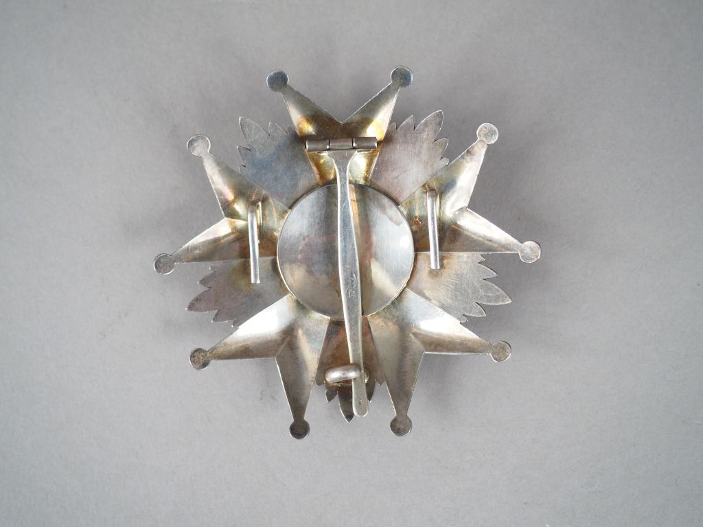 Plaque de Grand-Croix de la Légion d’Honneur Troisième République, bijou en argent massif . Centre bombé, tête de Marianne en relief, les cinq pointes pommetées et travaillées en pointe diamants très saillantes. Fixation par épingle à bascule centrale et deux crochets latéraux (95 mm x 95 mm). Etat 1