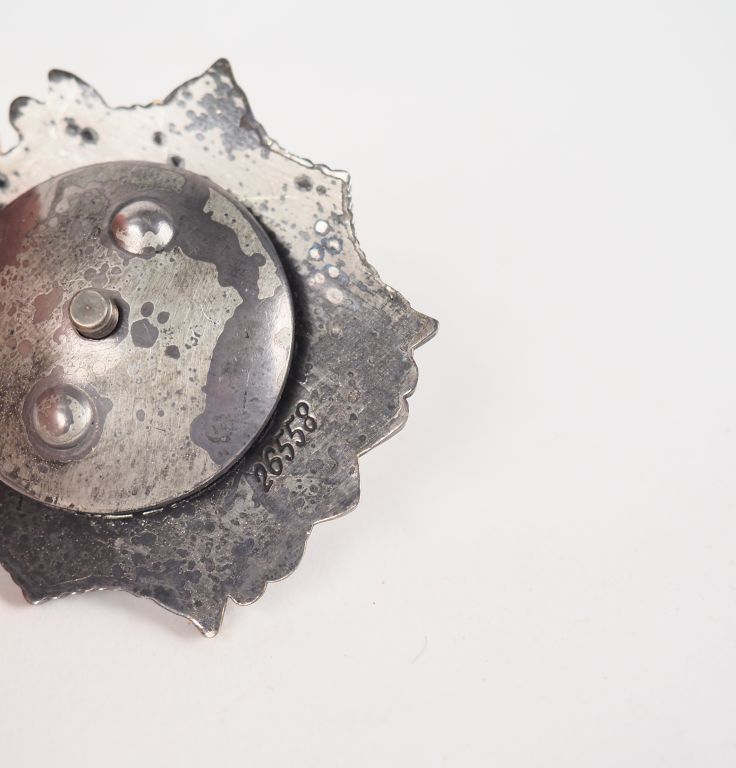 Plaque pectorale Soviétique en métal argenté et étoile rouge émaillée de l’ordre d’Alexandre Newski dans sa version du 29 Juillet 1942, plaque ronde à vis insigne numéro 26558 au dos. (Etat 2)