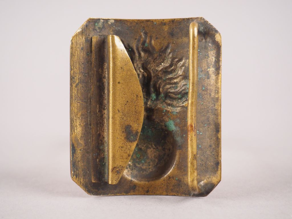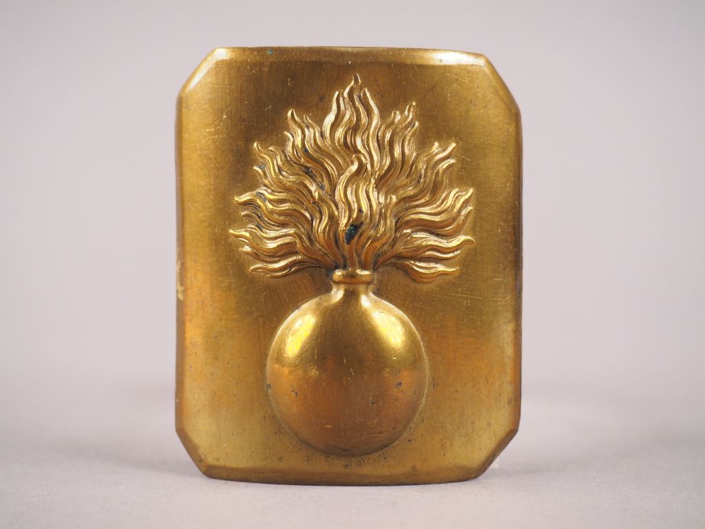 Plateau de ceinturon troupe de cavalerie Second Empire (grenadier à cheval ou cuirassier) en laiton embouti monobloc, plaque rectangulaire bombée en laiton rectangulaire à pans coupés (70 mm x 65 mm). Etat 1