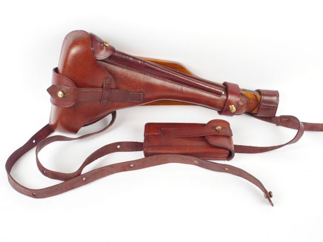 Réplique de très belle qualité du brellage réglementaire pour pistolet P08 (LANGE PISTOL 08). Cet ensemble très bien réalisé en cuir fauve comporte la crosse d’épaule en bois avec son système de montage sur le pistolet, le holster, le porte chargeur double, bel ensemble idéal pour compléter un pistolet P08 d’artillerie, un ensemble d’époque étant devenu introuvable.1+