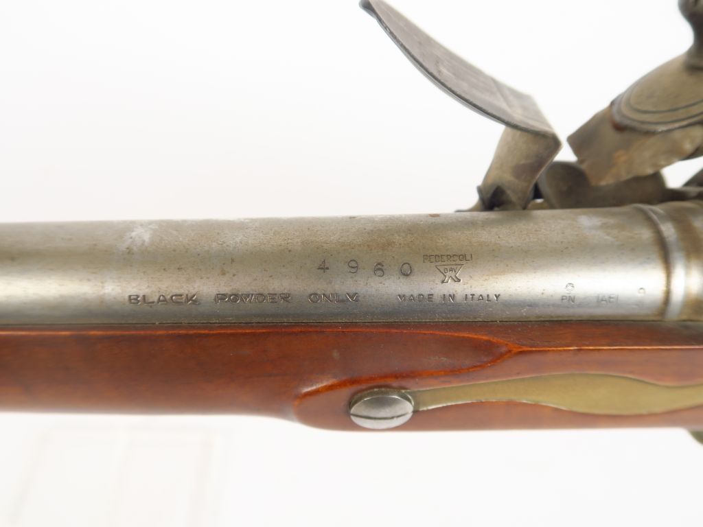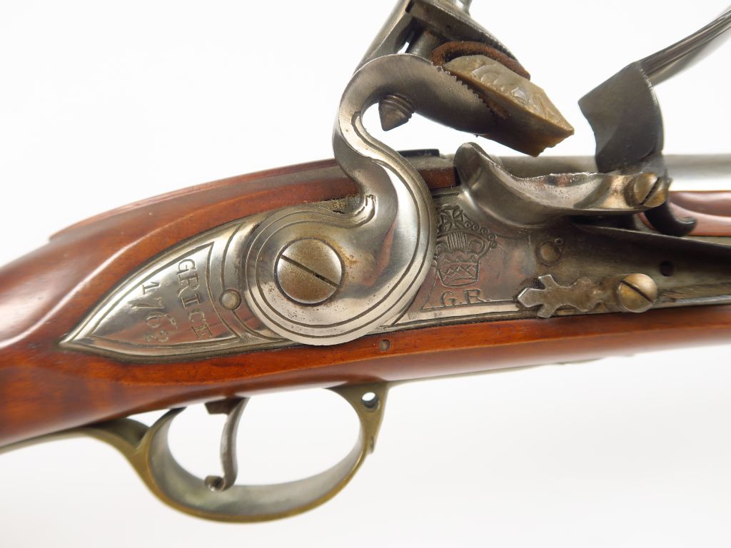 Réplique Italienne par Davide Pedersoli d'un mousqueton britannique Brow-Bess à silex signature sur la platine"G.R. couronné (Georges REX") et "GRICE 1762", arme numéro 4960, éprouvée et apte au tir (n'ayant probablement jamis tiré) arme montée laiton avec sa baguette, longueur totale:120 Longueur du canon:780 calibre 75.(1). Arme de catégorie D.